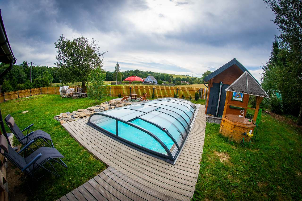 Dominantou okolí domu a zahrady je terasa a bazén. Terasa navazuje na dům a je přístupná z jeho vnitřních částí. Je také dostatečně velká, takže poskytuje dostatek prostoru pro všechny ubytované. Pod její střechou je možné ralaxovat v horkých letních dnech, zahrát si s přáteli stolní fotbálek, ping-pong a nebo si ugrilovat něco dobrého k jídlu. Naproti terasy je pak krytý venkovní bazén o rozměru 6 x 3m sloužící k osvěžení a zábavě. Plocha kolem bazénu je opatřena dřevěnými prkny Thermowood, stejně tak i opalovací molo. Pro nejmenší děti je v blízkosti bazénu také dětské hřiště s domečkem, houpačkami a skluzavkou. Na zahradě nechybí ani prostorné ohniště s venkovními lavičkami, takže je možné opéct si buřtíka a nebo si uvařit guláš v kotlíku. Okolí domu je zpevněné a vydlážděné břidlicovými kameny a v přední části domu, za pojezdovou branou, je možné zaparkovat 1 - 2 os. automobily.