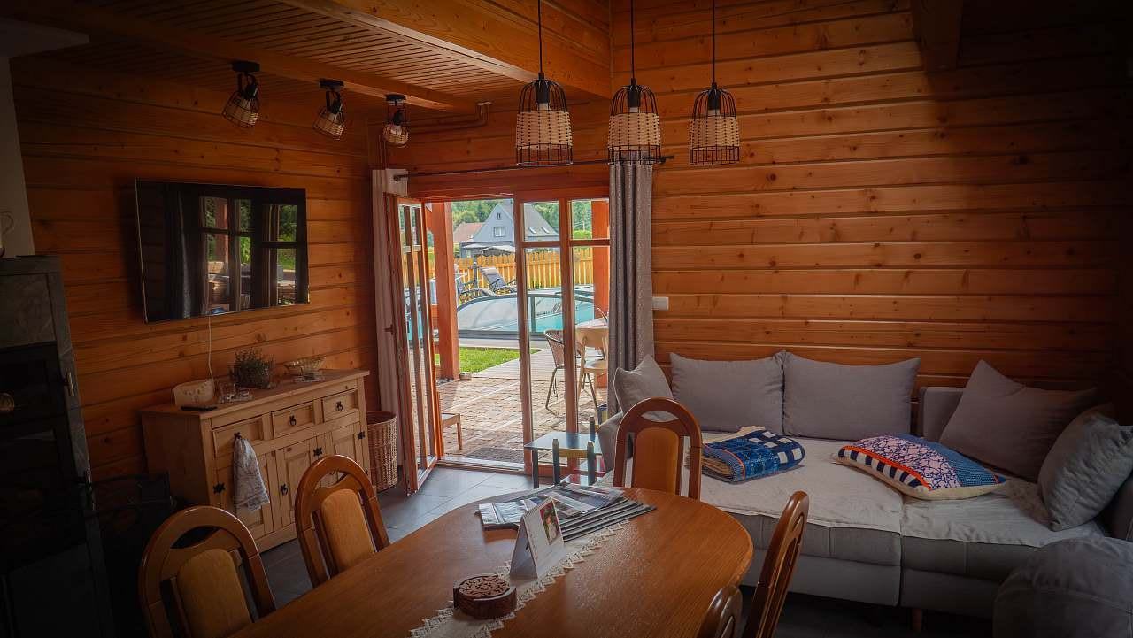 Přízemí roubenky je uspořádáno jako otevřený prostor, kde se dále nachází obývací pokoj s TV a rozkládací sedací soupravou. Součástí tohoto prostoru je také plně vybavená kuchyň a oválný stůl až pro 8 osob. Dalšími oddělenými místnostmi jsou koupelna se sprchovým koutem a WC a technická místnost s pračkou a sušičkou. Z obývacího pokoje lze taktéž vyjít přímo na terasu a k bazénu.